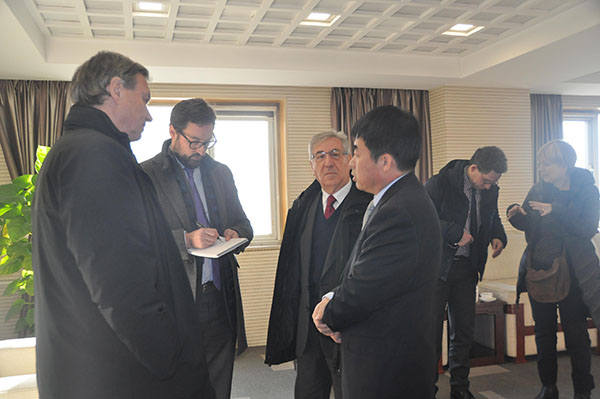 2016年11月22日,由歐盟環(huán)境委員維拉(部長級)率領(lǐng)的歐盟代表團(tuán),在歐盟駐華大使史偉(副部長級)的陪同下,一行16人,頂著入冬的第一場雪參訪華新環(huán)保與我公司總經(jīng)理王建明親切會見,并進(jìn)行座談。
